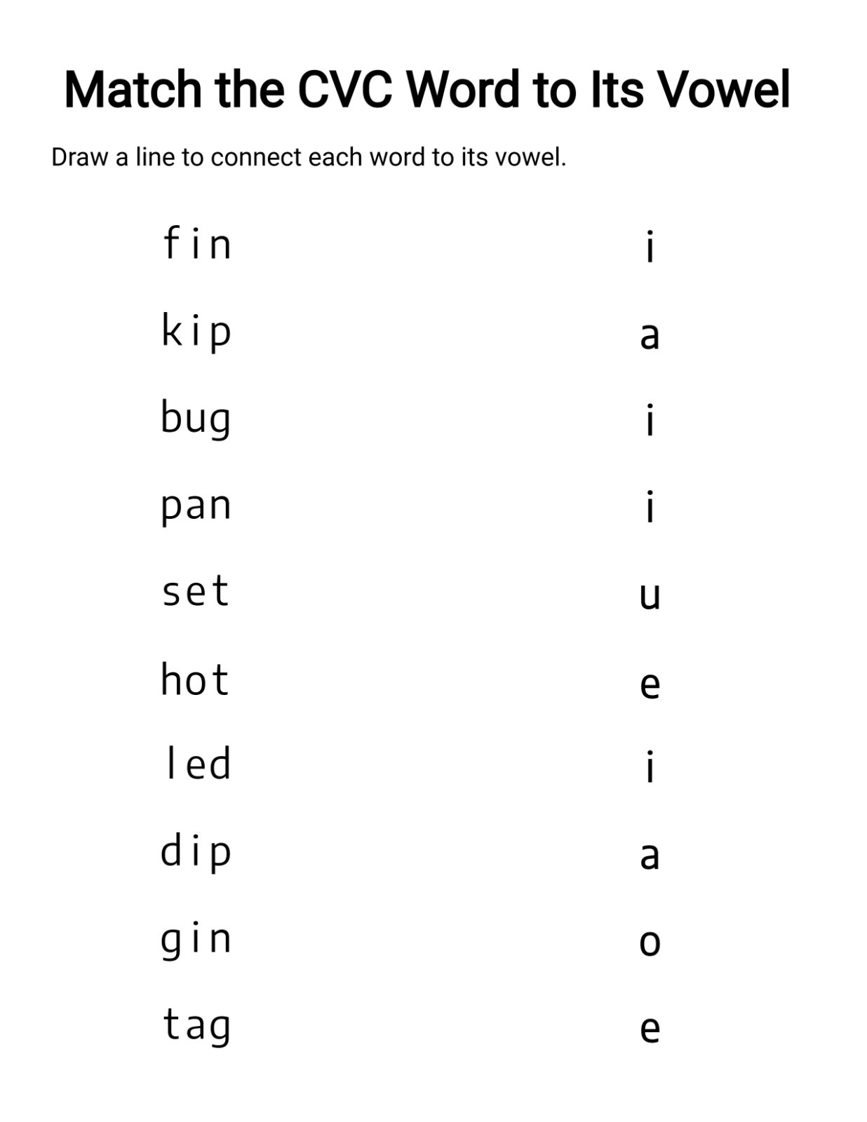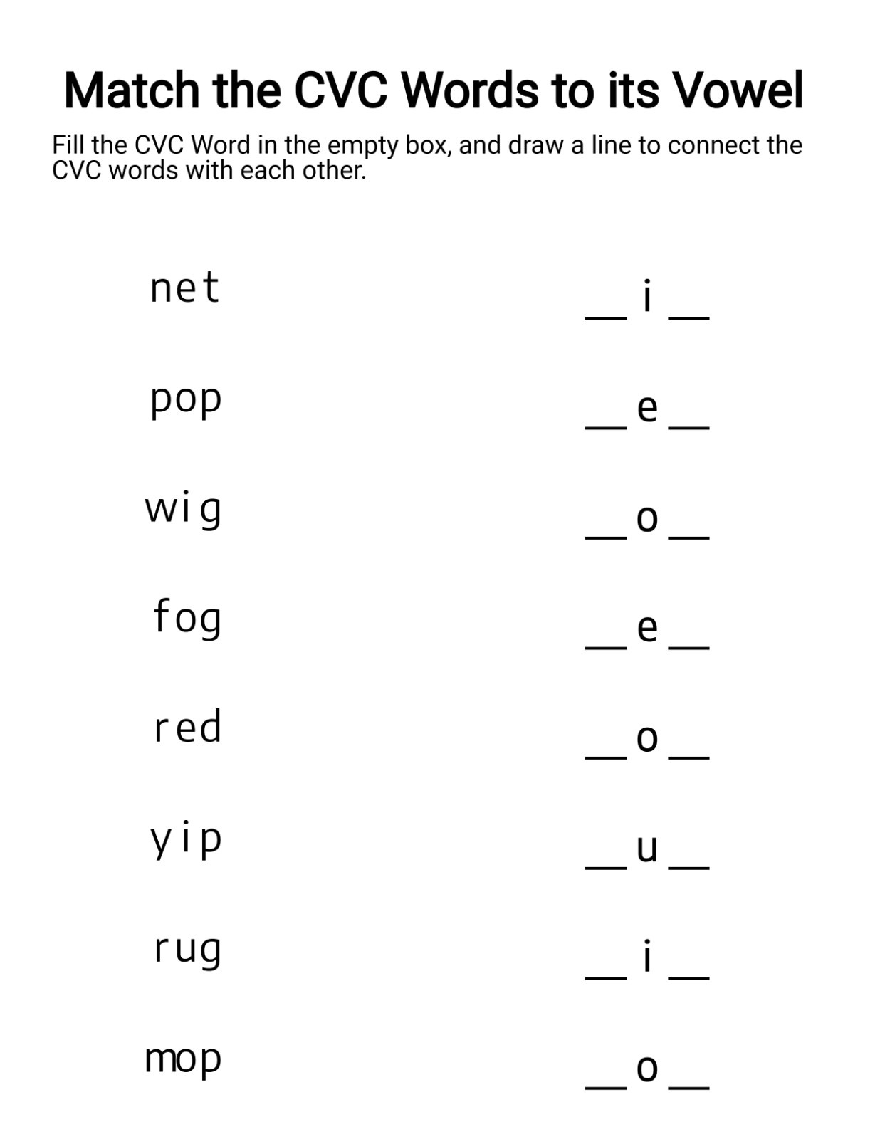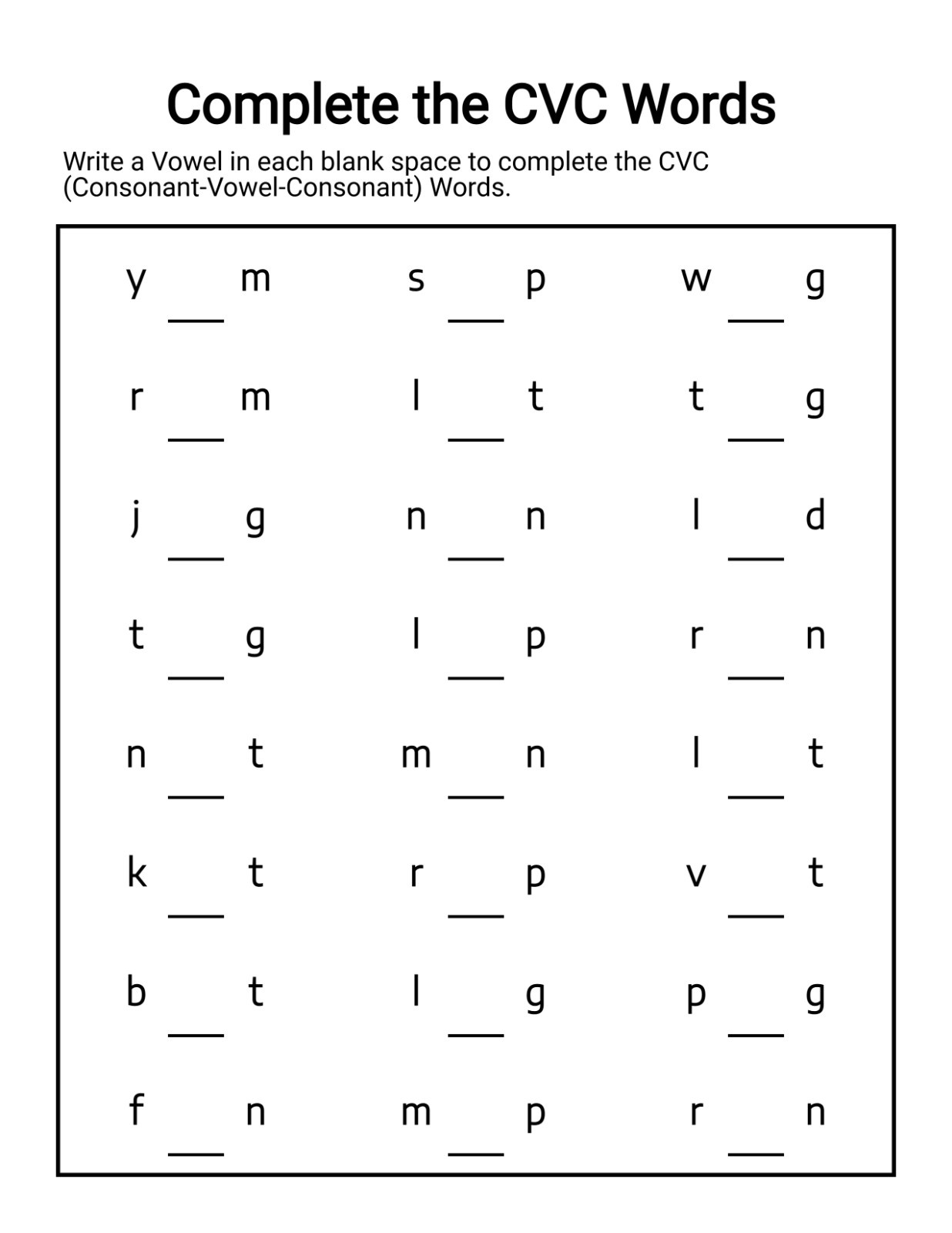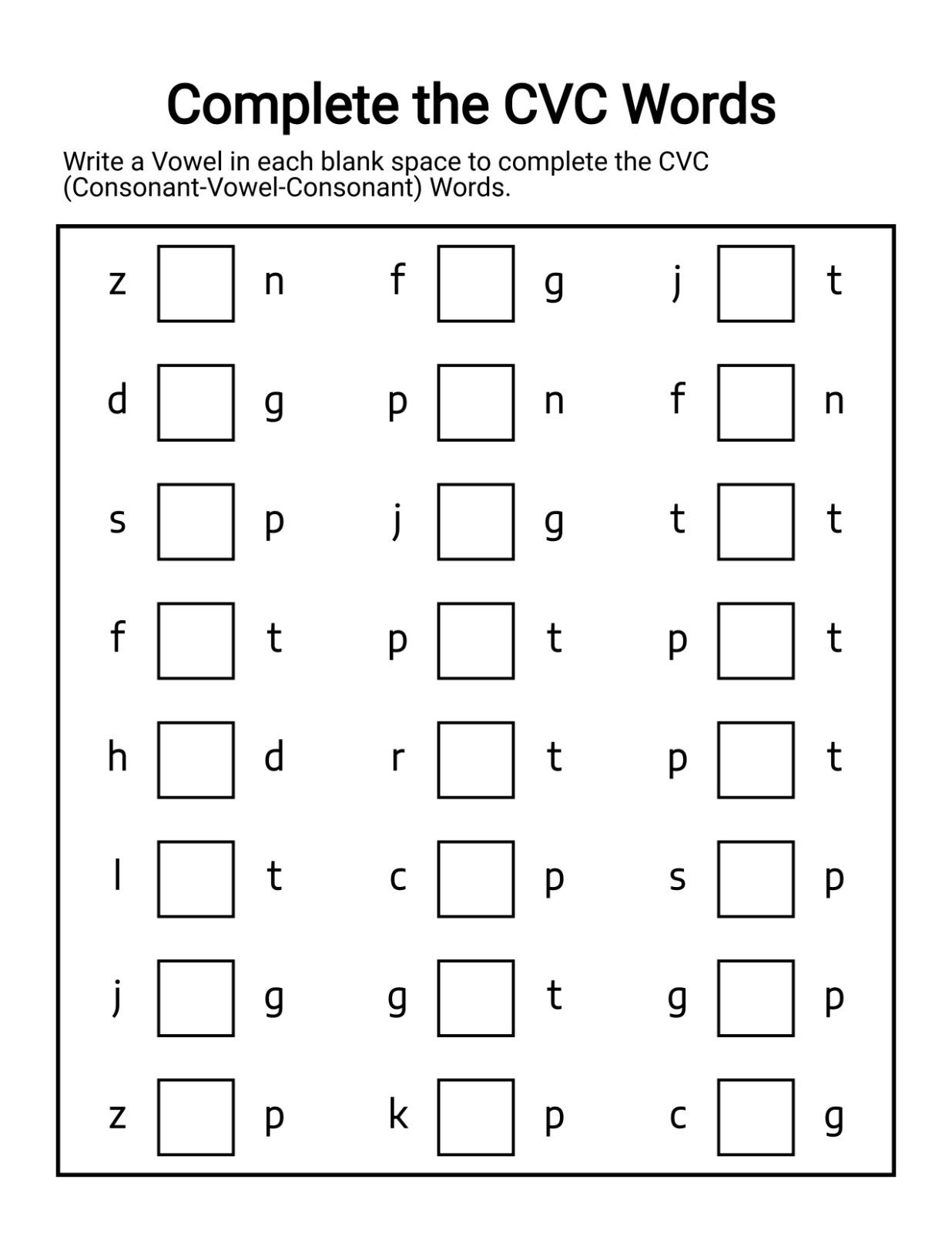 By filling in the missing vowel, kids learn to identify vowel sounds in context instead of guessing blindly. This activity sharpens listening skills and builds confidence in recognizing short vowel patterns.