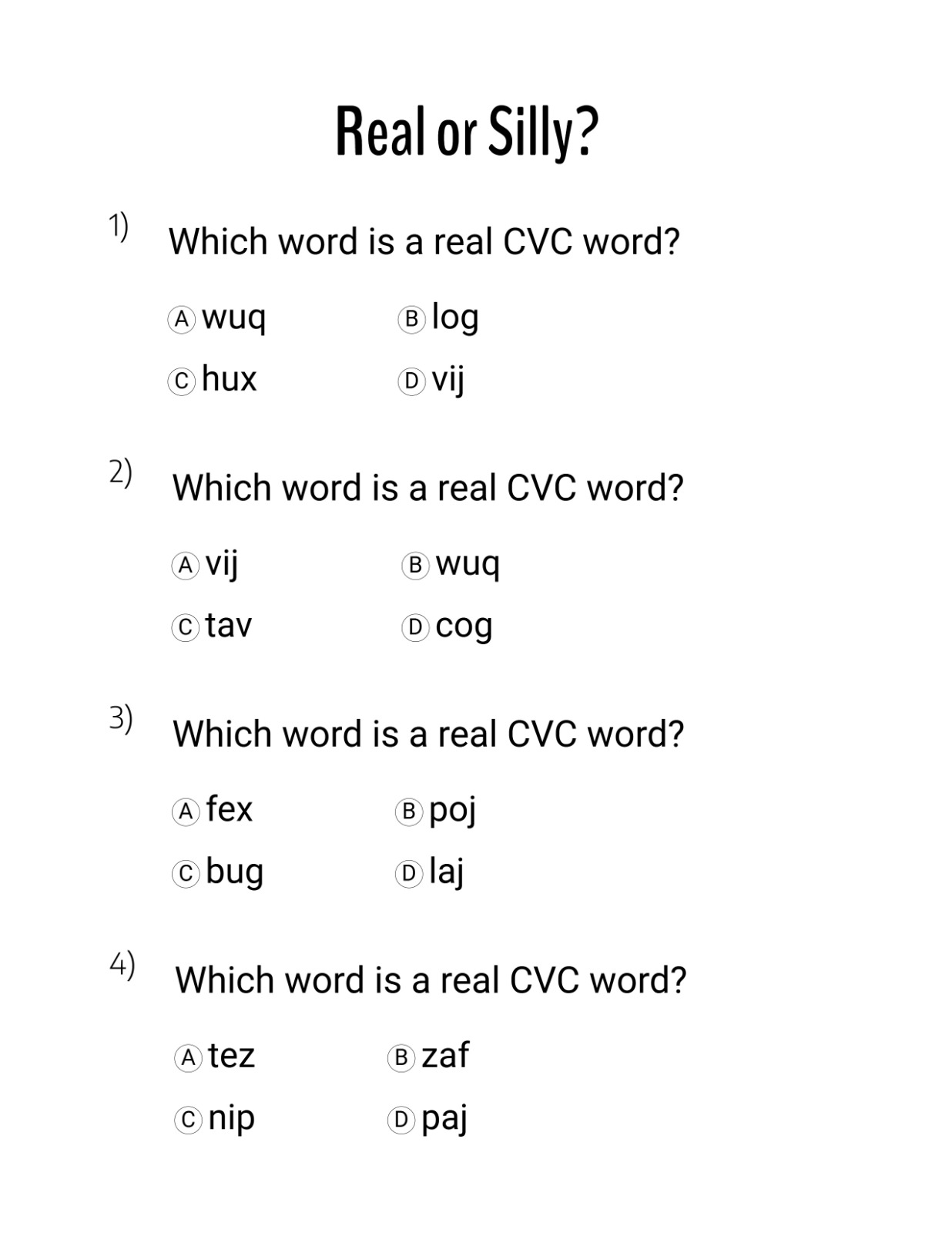 Children are presented with multiple similar-looking words and asked to identify the correct CVC structure. This sharpens attention to detail and reduces common early reading errors.