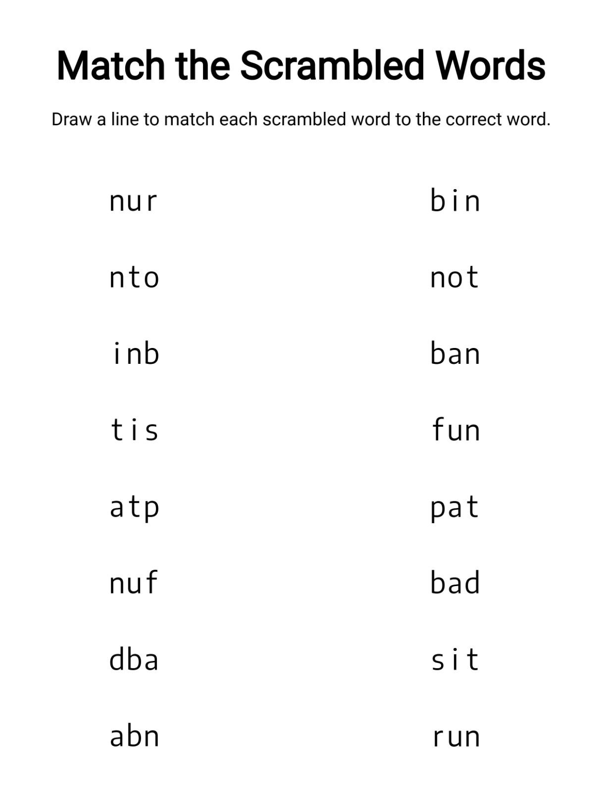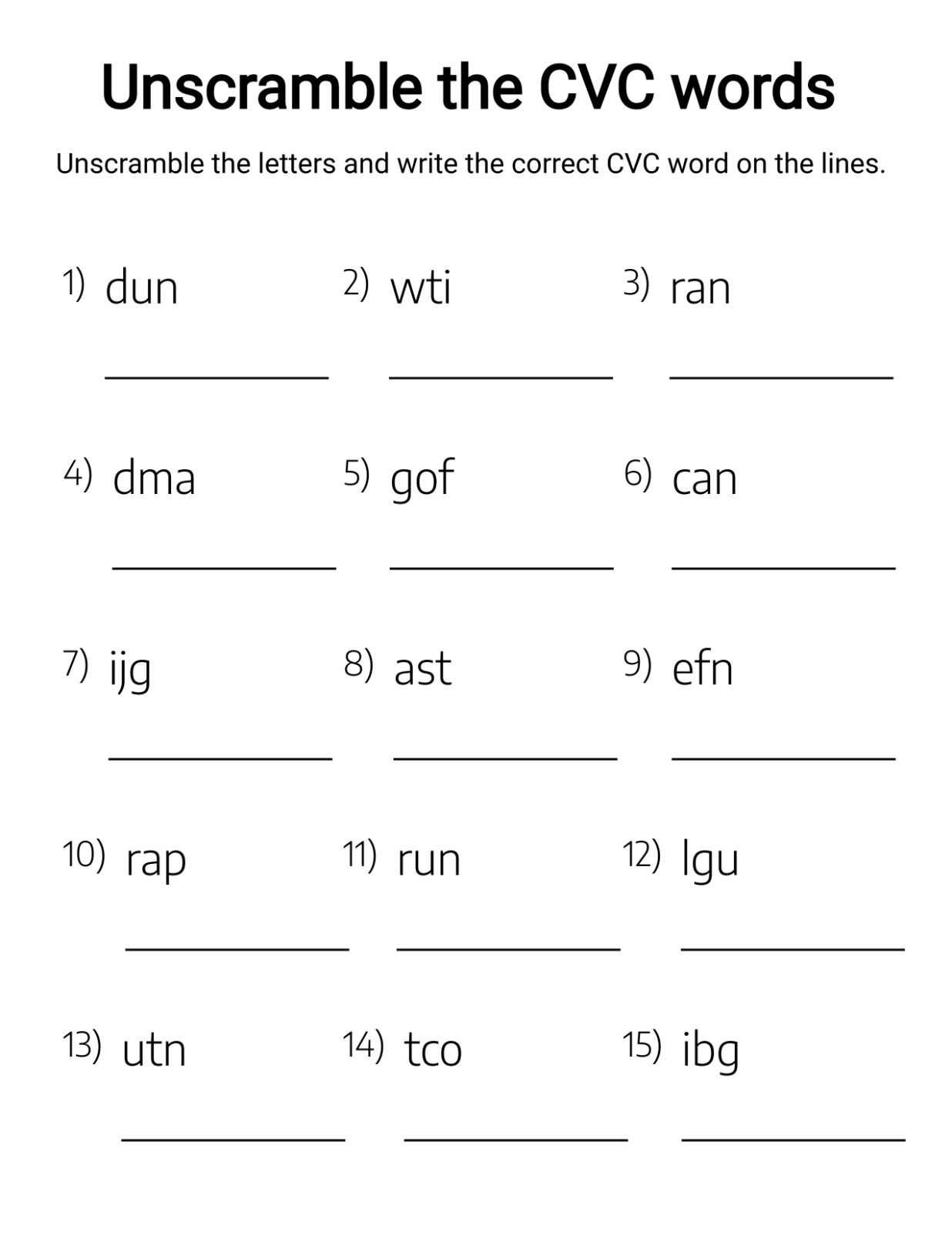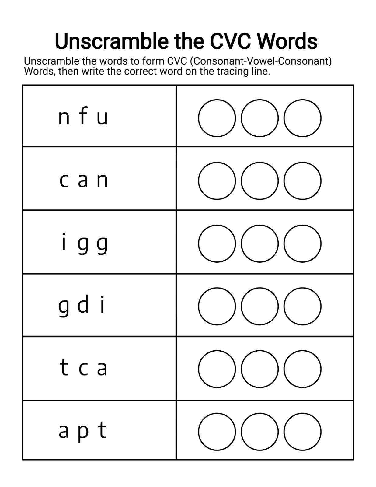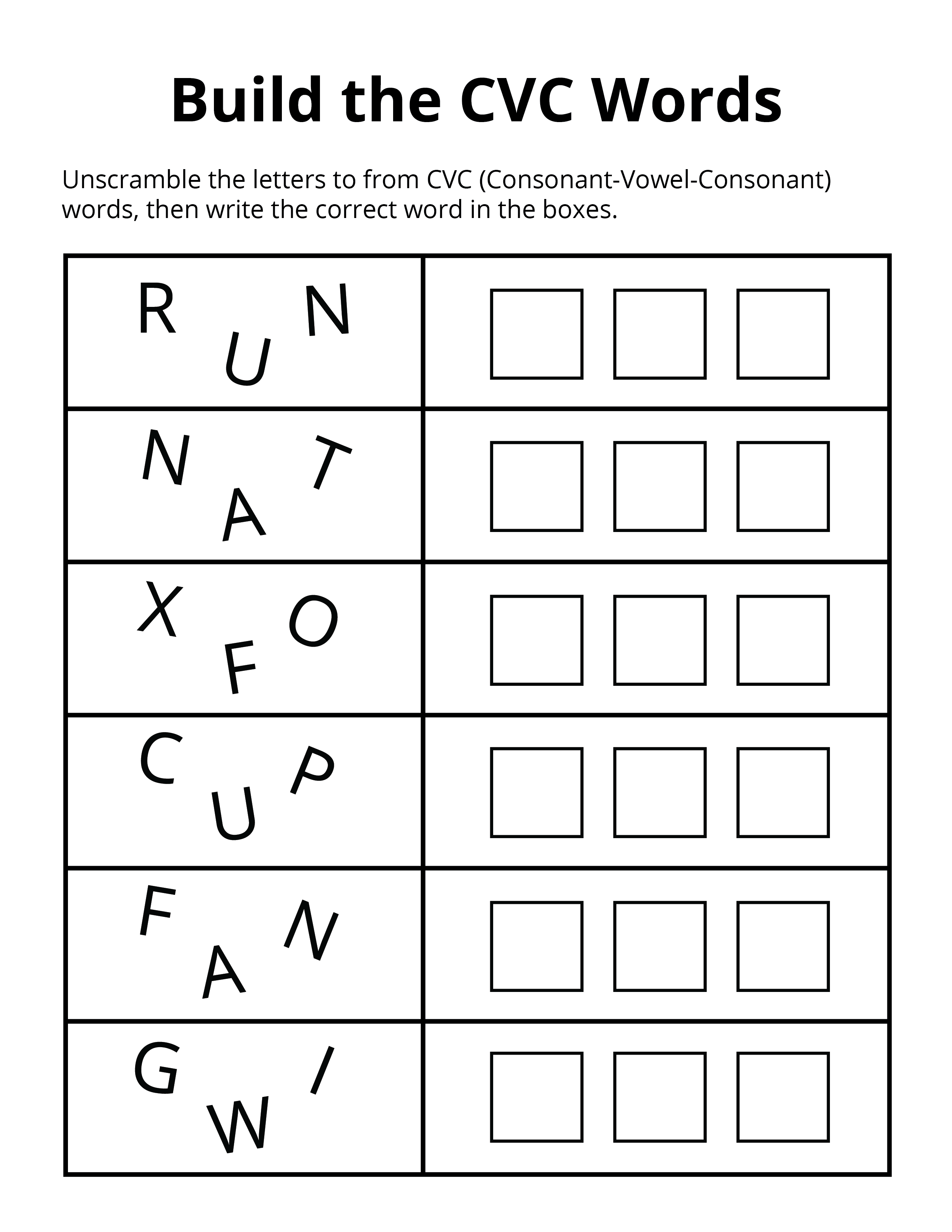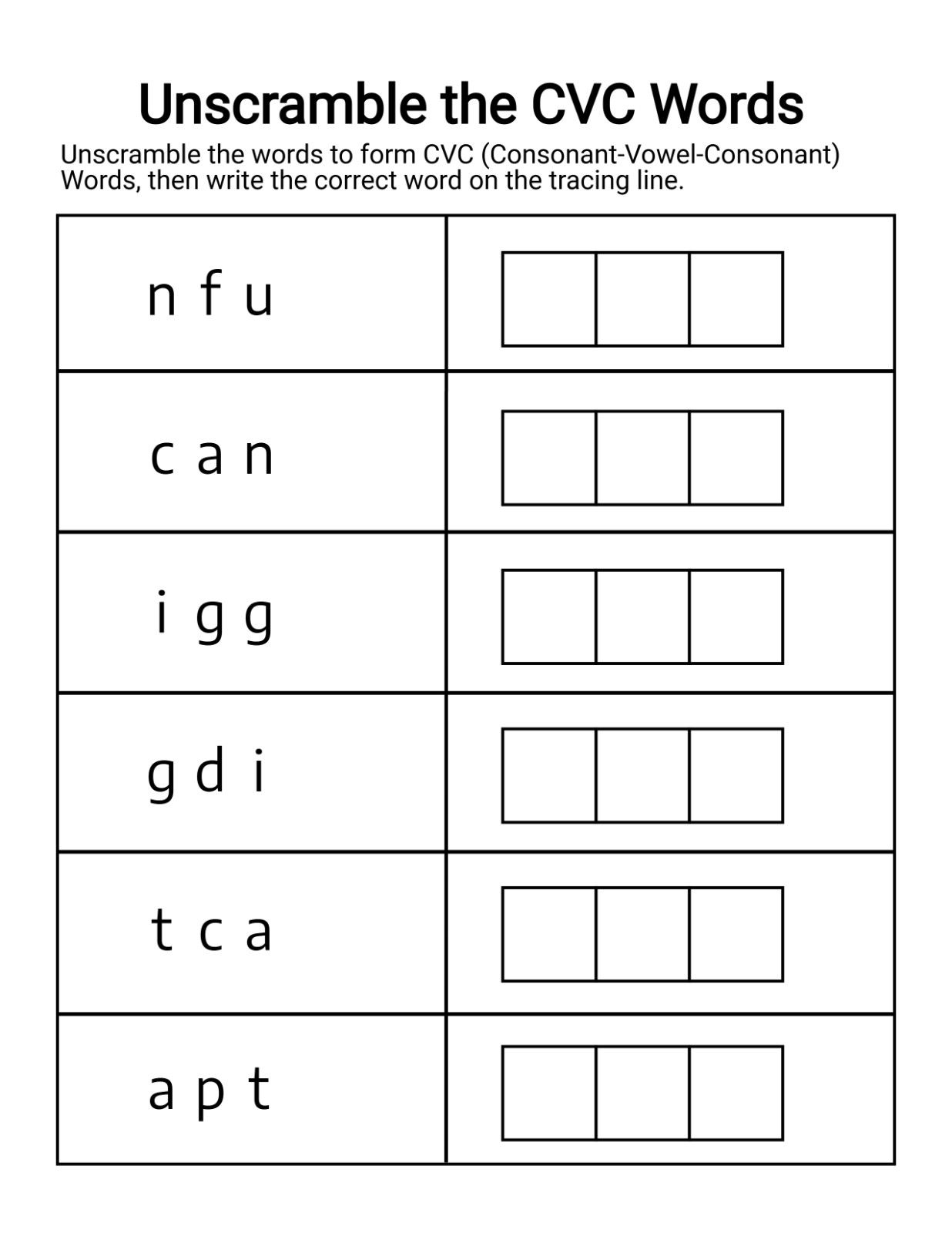 This worksheet encourages children to analyze letter sounds, rearrange them correctly, and then construct the complete CVC word. It strengthens phonemic awareness and reinforces the left-to-right reading pattern essential for early literacy.