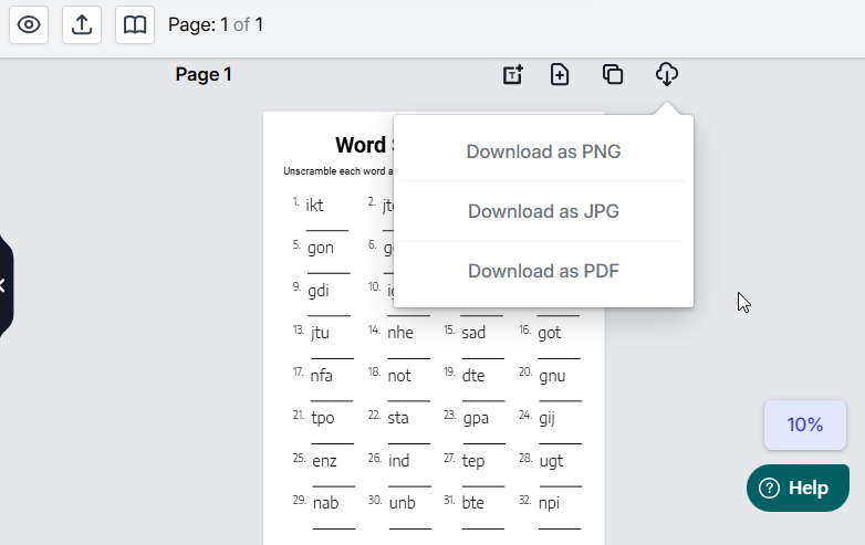 A “Download” happens when you click on any of the download buttons and that ends up downloading a single file or zipped file to your local computer. So if you create just one page worksheet and download it that would count as 1 credit used. If you create a 10 page book containing multiple pages of CVC word worksheets and download the entire book in one click then that would count as 1 download credit as well.