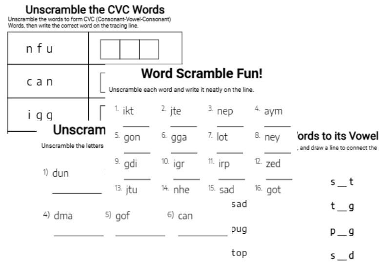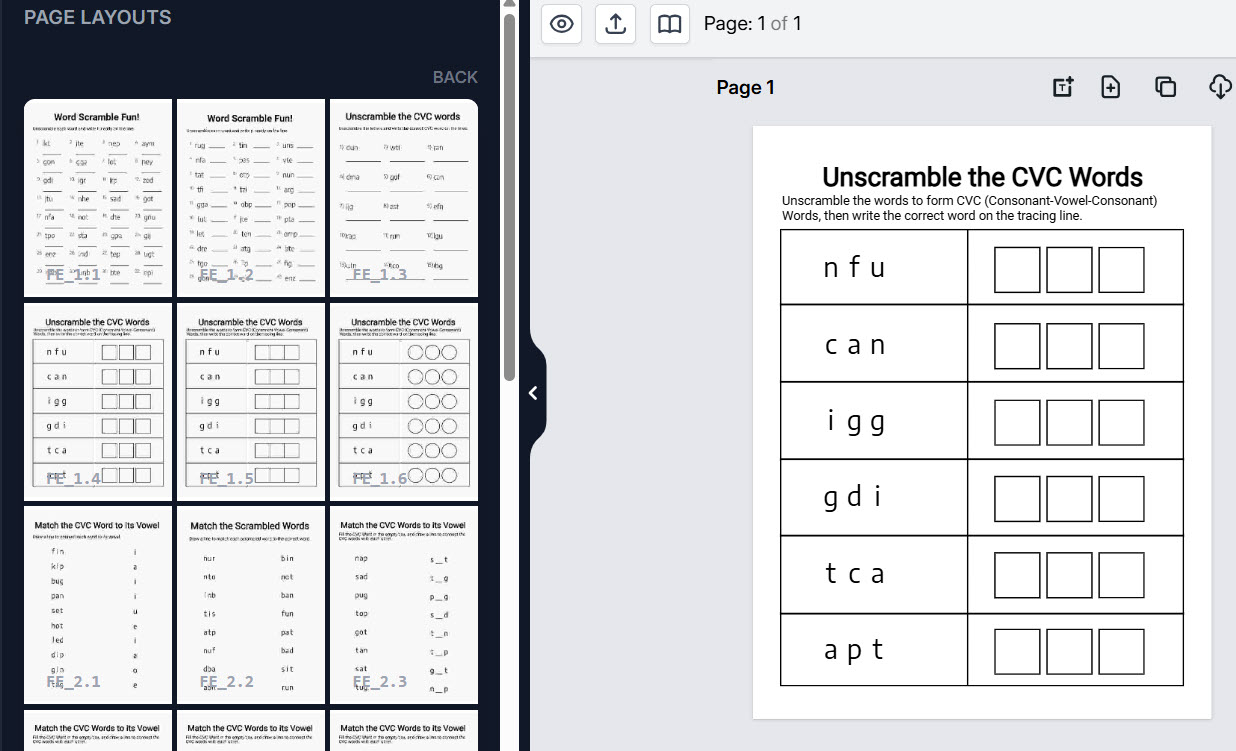 CVCWG lets you use the same layout style to build multiple learning concepts around it — from vowel identification to scrambled word recognition to consonant completion and beyond. Instead of creating entirely new page structures for every skill, you can reinforce different phonics objectives within familiar, consistent designs. That means deeper practice, stronger retention, and more value packed into every workbook.