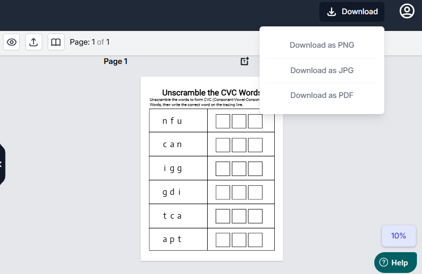 You can download your CVC workbooks in three convenient formats: PNG, JPG and PDF. Pick and choose whether you want to download the entire books or individual worksheets.